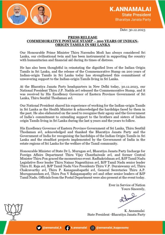 එනමුදු, ශ්රී ලංකාවේ වැවිලි කර්මාන්තය සහ අනෙකුත් යටිතල පහසුකම් ස්ථාපිත කිරීම සඳහා වෙහෙසුනු ඉන්දීය සම්භවයක් සහිත දමිළ ජනයාගේ මෙහෙවර ඇගයීම සඳහා අගනා සමරු මුද්දරයක් ඉන්දීය තැපැල් අමාත්යාංශය 2023 දෙසැම්බර් 30 වැනි දින නිකුත් කළේය. ඉන්දීය අග්රාමාත්ය නරේන්ද්ර මෝදි මහතාගේ උපදෙස් මත සහ තමිල්නාඩුවේ භාරතීය ජනතා පක්ෂයේ සභාපති කේ. අන්නමලෙයි මහතාගේ එකඟතාවය මත තමිල්නාඩුවේ එම පක්ෂ මූලස්ථානයේදී මෙම සමරු මුද්දරය මුලින්ම පිරිනමන ලද්දේ ශ්රී ලංකාවේ නැගෙනහිර පළාතේ ආණ්ඩුකාර සහ ලංකා කම්කරු කොංග්රසයේ නායක සෙන්තිල් තොණ්ඩමන් මහතා වෙතයි. අන්නමලෙයි මහතා නිවේදනයක් නිකුත් කරමින් කියා සිටියේ, “ඉන්දියානු සම්භවයක් ඇති දෙමළ ජාතිකයන් ශ්රී ලංකාවට පැමිණීමේ 200 වසරක සමරුව වෙනුවෙන් තැපැල් සමරු මුද්දරයක් නිකුත් කිරීම, වැවිලි කර්මාන්තය ස්ථාපිත කිරීම සඳහා ඔවුන් දැරූ වෙහෙස පිළිගැනීමක්" ලෙසටයි.