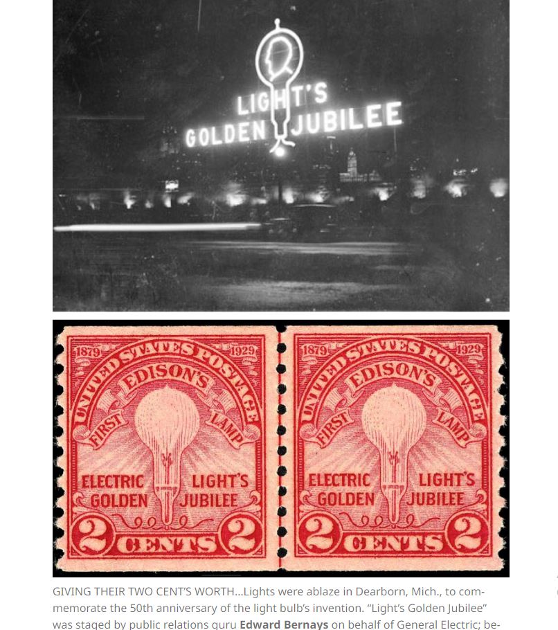 ලෝක ඉතිහාසයේ ප්රථම වරට සන්නිවේදන මෙවලමකින් ඔබ්බට තැපැල් මුද්දරයක් "මහජන සම්බන්ධතා ආකෘතියක්" ලෙස භාවිතයට ගනු ලබන්නේ 1929 දී සමරනු ලබන “Light’s Golden Jubilee" ව්යපෘතියේ දී ය. Light’s Golden Jubilee යනු තෝමස් අල්වා එඩිසන් විසින් විදුලි බල්බය සොයාගැනීමේ 50 වන සංවත්සර (1879-1929) සැමරුම් උත්සවයයි. ජෙනරල් ඉලෙක්ට්රික් (General Electric) සමාගම බර්න්ස්ගේ සේවාදායකයා විය. 1929 මැයි සිට ඔක්තෝබර් දක්වා මාස 6ක කාලයක් මෙම ව්යාපෘතිය පැවති අතර, උත්සවය පවත්වන ලද්දේ ඔක්තෝබර් 21 වන දිනයි.