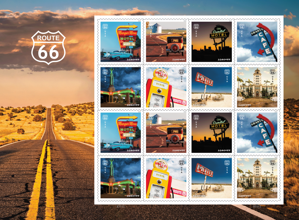 Route 66, the legendary 2,400-mile highway that stretched from Chicago to Los Angeles for a century, will celebrate its centennial in 2026, with thousands of people following the American dream along the route. Named “The Mother Road” by author John Steinbeck, Route 66 is a symbol of freedom and adventure. Honoring the enduring spirit and ongoing efforts to preserve this uniquely American treasure, the U.S. Postal Service’s new stamps are in advance of the iconic route’s 100th anniversary commemorative stamp issue.