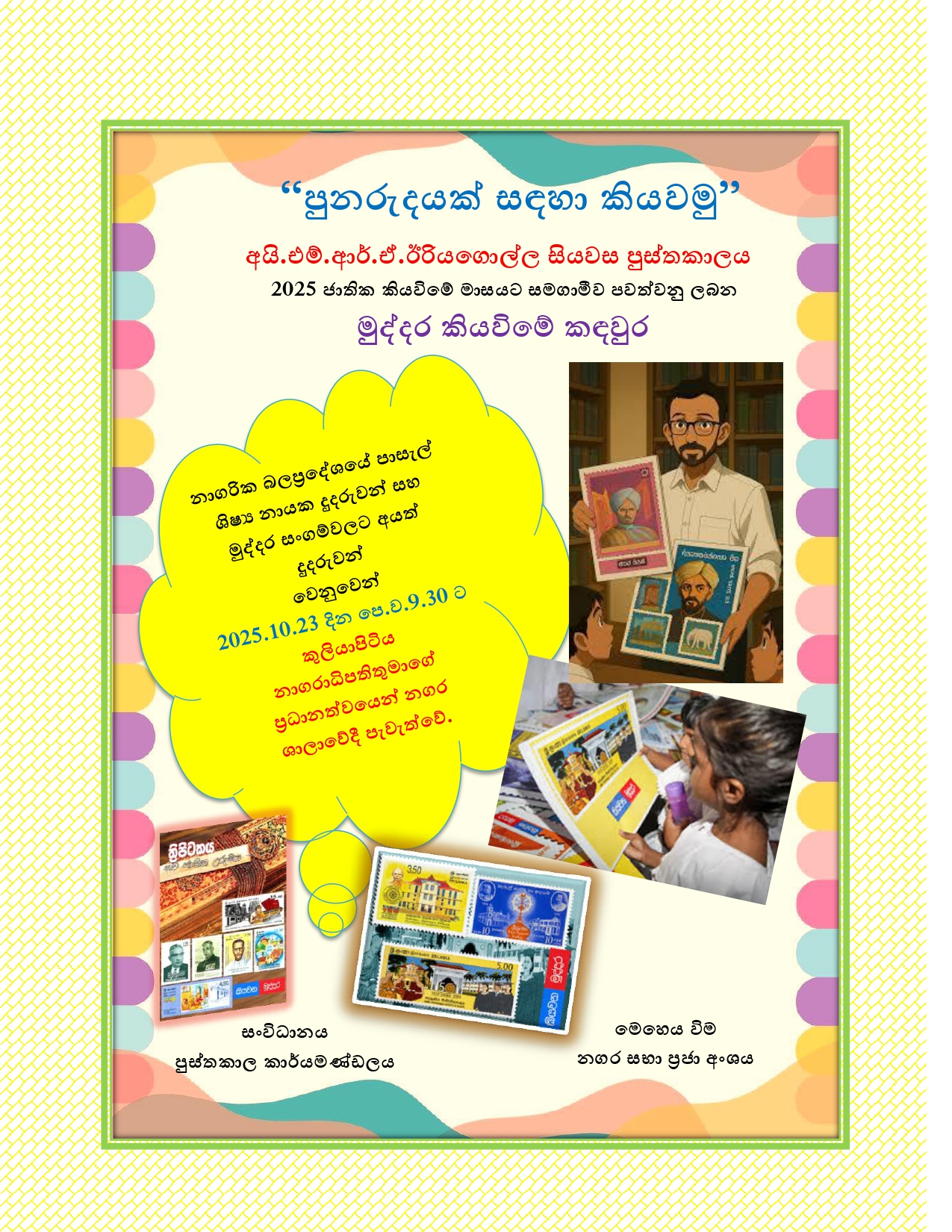 2025 ජාතික කියවිමේ මාසයට සමගාමීව කුලියාපිටිය අයි.එම්.ආර්.ඒ.ඊරියගොල්ල සියවස පුස්තකලය සංවිධානය කරන ලද මුද්දර කියවීමේ කඳවුර ගරු නගරාධිපතිතුමාගේ ප්රධානත්වයෙන් 2025 ඔක්තෝබර් 23 දින කුලියාපිටිය නගර සභා ශාලාවෙිදී ඉතා සාර්ථකව පැවැත්විණි.