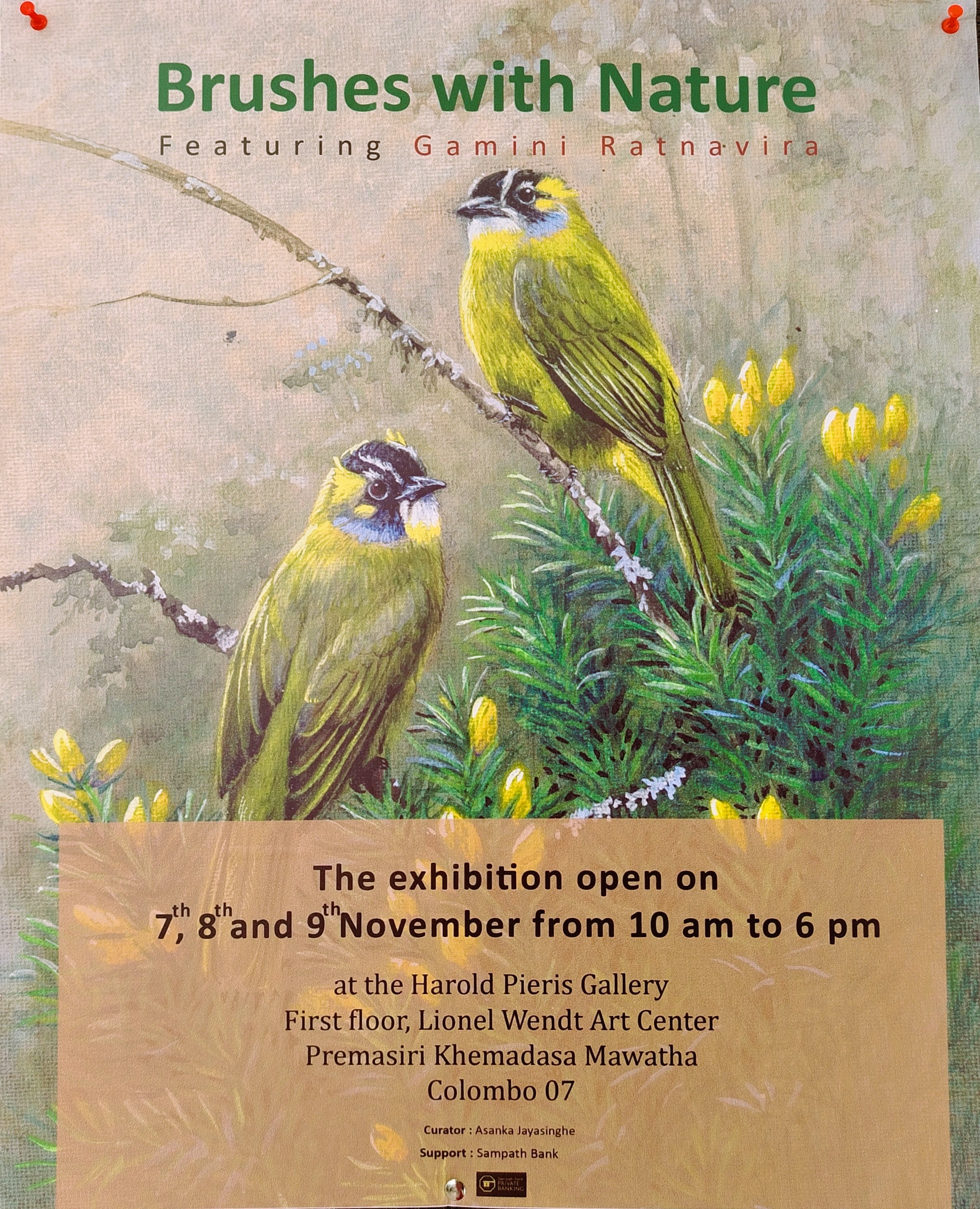 Mr. Gamini Ratnavira's 4th art exhibition titled "Brushes with Nature" is held from 7-9 November 2025 at the Harold Peiris Gallery of the Lionel Wendt Art Theater. There 50 original paintings of Sri Lankan flora and fauna is on display.
